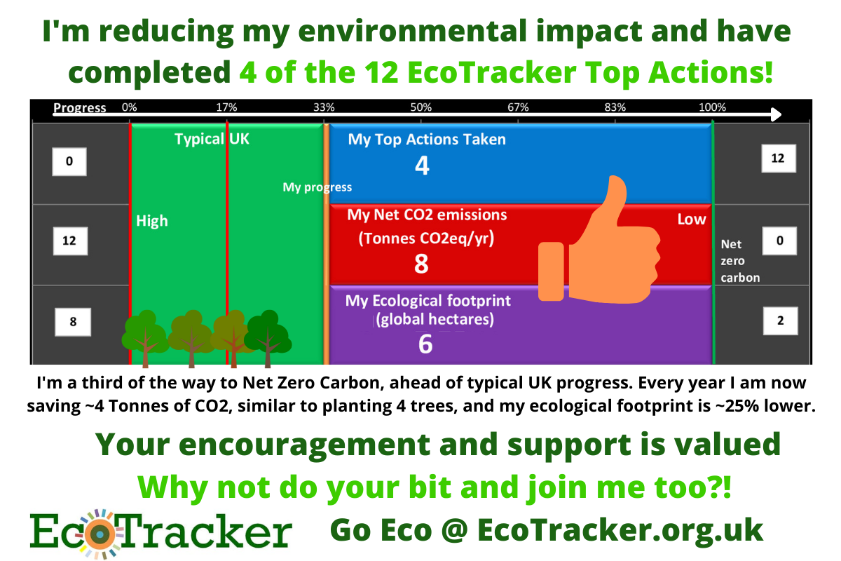 I'm reducing my environmental impact and have completed 4 of the 12 EcoTracker Top Actions. Graphics show a bar graph indicating 4 actions taken, 8Tonnes of CO2 emissions per year and 6 global hectares and also 4 large trees and a hand with thumbs up. I'm a third of the way to Net Zero Carbon, ahead of typical UK progress. Every year I am now saving ~4 Tonnes of CO2, similar to planting 4 trees, and my ecological footprint is ~25% lower. Your encouragement and support is valued. Why not do your bit and join me too. Go Eco @ EcoTracker.org.uk