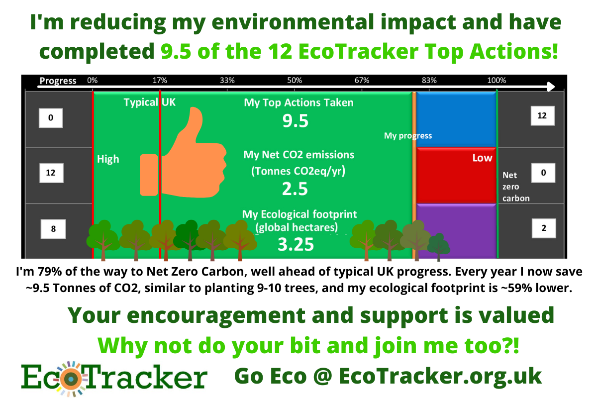 I'm reducing my environmental impact and have completed 9.5 of the 12 EcoTracker Top Actions. Graphics show a bar graph indicating 9.5 actions taken, 2.5Tonnes of CO2 emissions per year and 3.25 global hectares and also 9 large trees and a small tree and a hand with thumbs up. I'm 79% of the way to Net Zero Carbon, well ahead of typical UK progress. Every year I now save ~9.5 Tonnes of CO2, similar to planting 9-10 trees, and my ecological footprint is ~59% lower. Your encouragement and support is valued. Why not do your bit and join me too. Go Eco @ EcoTracker.org.uk